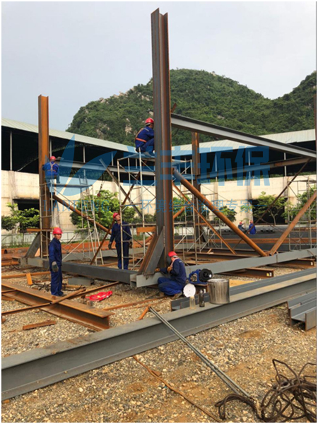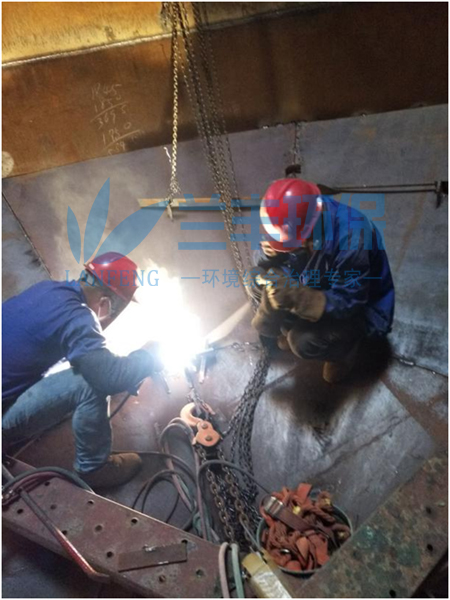 這是繼去年煅燒爐脫硫脫硝后焙燒爐脫硫濕電工程。為保證9月中旬具備調(diào)試條件,大家正對塔體內(nèi)外部進(jìn)行焊接(圖2)。