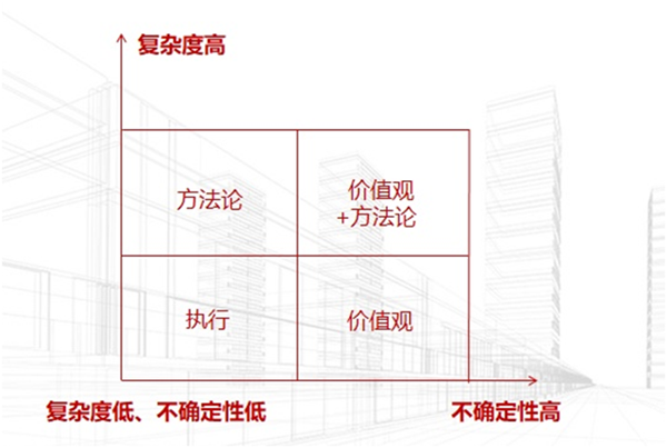 復(fù)雜性低,不確定性低的的環(huán)境,員工只需要有執(zhí)行力就可以;越是復(fù)雜性高的環(huán)境下,我們?cè)叫枰椒ㄕ摰闹笇?dǎo);越是不確定性高的環(huán)境下,我們?cè)叫枰獌r(jià)值觀的指導(dǎo);不論你是不是管理者,我都鼓勵(lì)你多總結(jié)方法論。