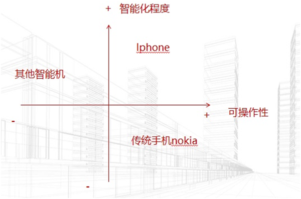 一個(gè)方法論之所以能夠成為方法論,包括能立的起來,絕對(duì)不是拍腦袋能搞得定的。在很多經(jīng)典的管理學(xué)著作、心理學(xué)著作里面,都有大量的模型和方法論。比如說下面這個(gè)很經(jīng)典的四象限,是喬布斯曾經(jīng)用來去區(qū)分自己和其他智能手機(jī)的差異的。表達(dá)的意思是比我iphone智能的手機(jī),操作便捷性不如我。便攜性比我好的這些傳統(tǒng)手機(jī)智能化程度不如我。