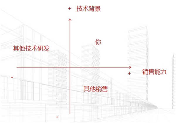 假設(shè)你是一位技術(shù)背景的銷售。你是不是可以模仿這個(gè)四象限,畫出自己的競(jìng)爭(zhēng)優(yōu)勢(shì)。