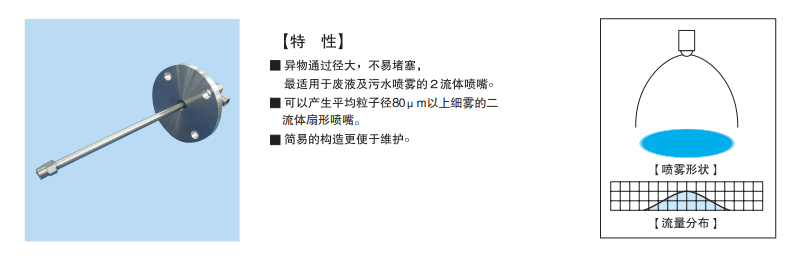 異物通過徑大,不易堵塞。最適用于廢液及污水噴霧的2流體噴嘴,可以產(chǎn)生平均粒子徑80um以上細(xì)霧的二流體扇形噴嘴。