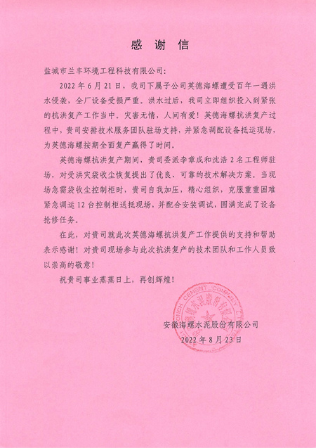 涼風(fēng)和秋雨之外,今天,我司收到一份珍貴的禮物,海螺水泥給我司發(fā)來感謝信。6月底,廣東英德遭遇百年一遇的洪澇災(zāi)害,我司為英德海螺安裝的除塵器控制柜淹水損壞,我司在得到消息后,立即安排李章成和沈浩趕赴并駐守項(xiàng)目,并緊急調(diào)配12臺(tái)電控柜運(yùn)抵現(xiàn)場,圓滿完成搶修任務(wù),助力英德海螺按期全面復(fù)產(chǎn)??蛻舻母兄x和認(rèn)可,鼓舞我們繼續(xù)前行和不懈奮斗。