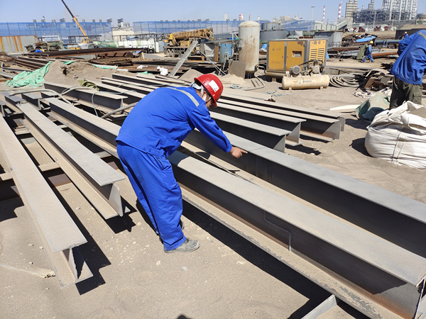工程現(xiàn)場(chǎng)時(shí)常見(jiàn)到項(xiàng)目經(jīng)理孫萬(wàn)貴忙碌的身影,他精益求精,嚴(yán)把質(zhì)量關(guān),每道工序都嚴(yán)格自檢,不放過(guò)任何影響質(zhì)量的細(xì)節(jié),在濕電鋼架對(duì)接及噴砂完成后,他立即對(duì)其進(jìn)行仔細(xì)檢查(圖2)。