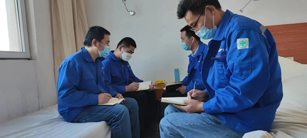 因疫情影響,項(xiàng)目所在地西寧正實(shí)行靜態(tài)管理期間,項(xiàng)目部人員積極響應(yīng)就地過(guò)節(jié)號(hào)召,9月9日,倪新華、曹增政、周乃春、王勇奎等四位同事,在賓館召集項(xiàng)目碰頭會(huì),商討防疫部署和后續(xù)項(xiàng)目推進(jìn),確保防疫、工作兩不誤。