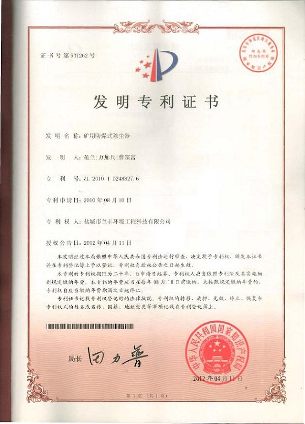 日前接到國(guó)家知識(shí)產(chǎn)權(quán)局通知,我司于2010年8月10日申請(qǐng)的發(fā)明專利《礦用防爆式除塵器》已正式授權(quán),并取得了授權(quán)證書。