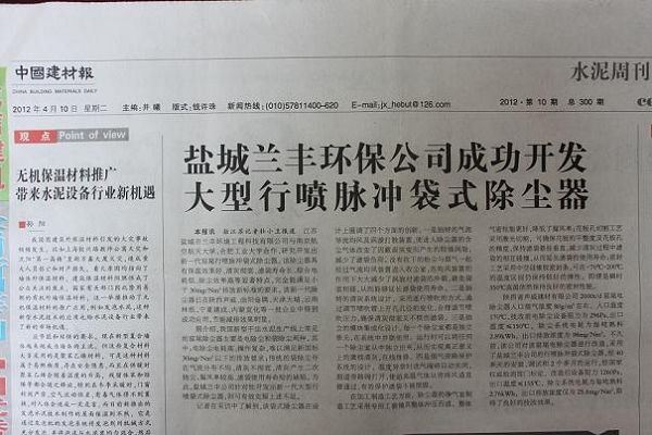 近日中國建材報發(fā)表了我司技術(shù)部王加?xùn)|的一篇題為《鹽城蘭豐環(huán)保公司成功開發(fā)大型行噴脈沖袋式除塵器》的文章,原文如下: