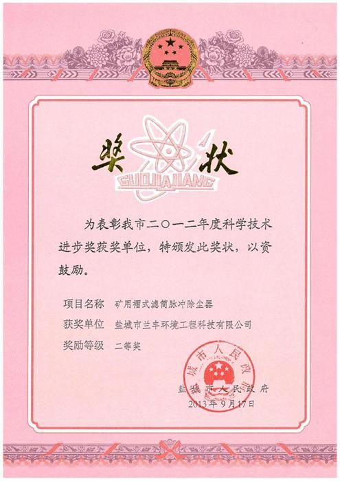 近日,鹽城市人民政府隆重舉行了2012年度鹽城市科學技術(shù)獎頒獎大會,我司研發(fā)的“礦用褶式濾筒脈沖除塵器”獲得了二等獎,實現(xiàn)了我司技術(shù)研發(fā)成果的歷史突破,標志著我司技術(shù)研發(fā)、應(yīng)用達到了較高的水平。