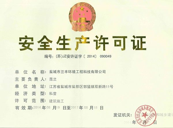 日前,接到江蘇省住建廳通知,我司獲得了安全生產(chǎn)許可證資質(zhì),標(biāo)志著我司進(jìn)入工程總承包后具備了自主安裝的資質(zhì),截止目前我司已具備了《環(huán)保工程專業(yè)承包》、《環(huán)境污染冶理資質(zhì)甲級(鍋爐、工業(yè)窯爐煙氣冶理)》、《環(huán)境污染冶理工程設(shè)計乙級》、《安全生產(chǎn)許可證》等工程施工、設(shè)計的資質(zhì)。