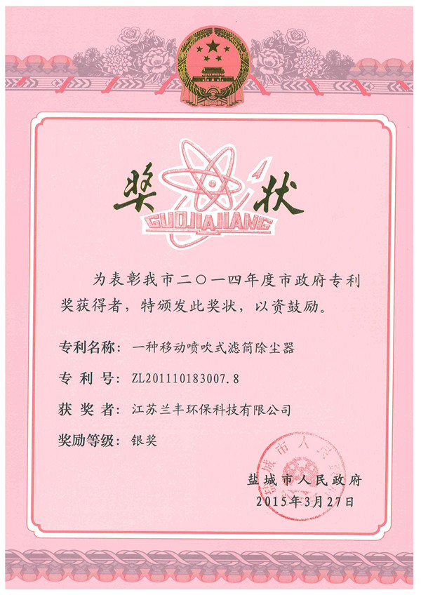 我司研發(fā)的《一種移動(dòng)式濾筒除塵器(ZL201110183007.8)》獲2014年度鹽城市專利獎(jiǎng)銀獎(jiǎng),這表明我司開發(fā)的移動(dòng)式濾筒除塵器不僅在市場(chǎng)推廣、實(shí)踐應(yīng)用上取得了豐碩的回報(bào),三年來共取得了近億元的銷售,經(jīng)濟(jì)效益可觀,同時(shí)也為環(huán)境粉塵治理作出了較大的貢獻(xiàn),尤其是煤礦井下粉塵的冶理,填補(bǔ)了國內(nèi)空白,并達(dá)國內(nèi)領(lǐng)先水平。而且更為可喜的是得到了政府的大力肯定,必將加大該產(chǎn)品的力度。